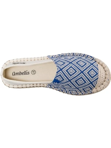 – im klassischen Espradrille-Design – Schuhweite: F – Obermaterial aus weichem TextilUnterstreichen Ihren perfekten Look: Die stilechten Espadrilles aus dem Hause ambellis. Das Futter aus Canvas ist angenehm anpassungsfähig. Dieses Schuhpaar kommt ohne Verschluss aus, sodass ganz bequem hineingeschlüpft werden kann. Das textile Obermaterial passt sich jedem Fuß an und überzeugt durch ein geringes Gewicht.Verschluss: SchlupfAbsatzart: FlachAbsatzhöhe: 0,3 cmSchuhweite: FObermaterial: Textil (Textil)Futter: Textil (Canvas)Decksohle: Textil (Canvas)Laufsohle: Sonstiges Material (TPR-Sohle)
