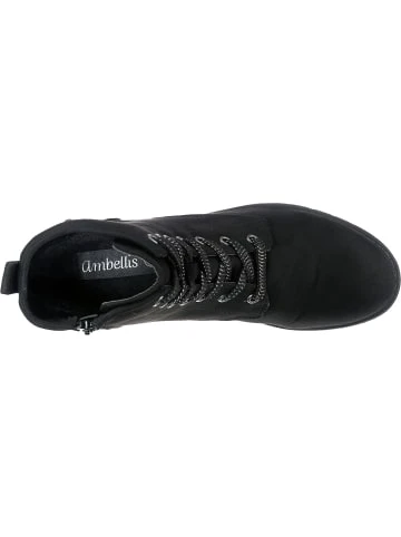 – verstärkter Fersenbereich – vegane Fertigung – Schuhweite: FDie Schnürstiefeletten der Marke ambellis sorgen stets für einen perfekten Look. Dank des Futters mit wärmenden Eigenschaften sind diese Schuhe optimal für kalte Tage geschaffen. Die textile Oberfläche ist anschmiegsam und hat ein geringes Gewicht. Der Blockabsatz kombiniert einen stilsicheren Auftritt mit hohem Tragekomfort. Zusätzlich zum Schnürverschluss ist das Modell mit einem Reißverschluss ausgestattet.Verschluss: Reißverschluss, SchnürverschlussAbsatzart: BlockabsatzAbsatzhöhe: 3,5 cmSchuhweite: FZusatzfunktion: Warmfutter, veganObermaterial: Textil (Polyester)Futter: Textil (Polyester)Decksohle: Textil (Polyester)Laufsohle: Sonstiges Material (TPR-Sohle)